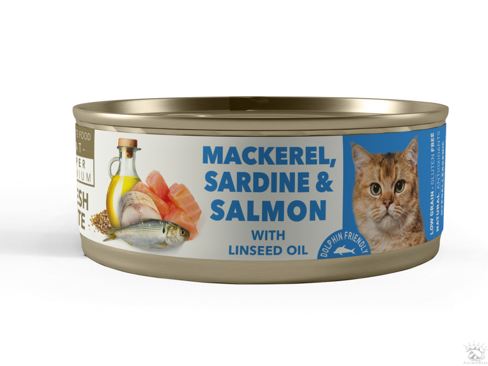 Pâtée AMITY Super Premium maquereau, sardine et saumon pour chat adulte.