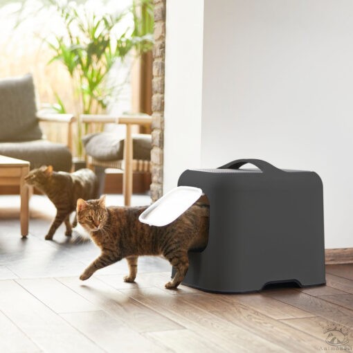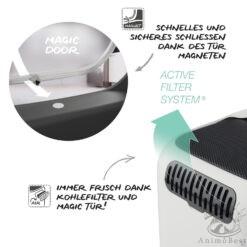 Souhaitez-vous un bac à litière design qui n’a pas à se cacher dans l’espace de vie ? Alors nous aimerions vous présenter les toilettes à capuchon Biala de Rotho Mypet ! Non seulement le look de cette litière est convaincant, mais l’hygiène n’est pas non plus négligée. Le bol en plastique est facile à nettoyer et grâce au filtre à charbon, il n’y a pas d’odeurs désagréables. La chatière se ferme rapidement et en toute sécurité avec un aimant, de sorte qu’aucune vapeur ne puisse s’échapper ici non plus. Le couvercle peut être facilement retiré d’une seule main pour le nettoyage.