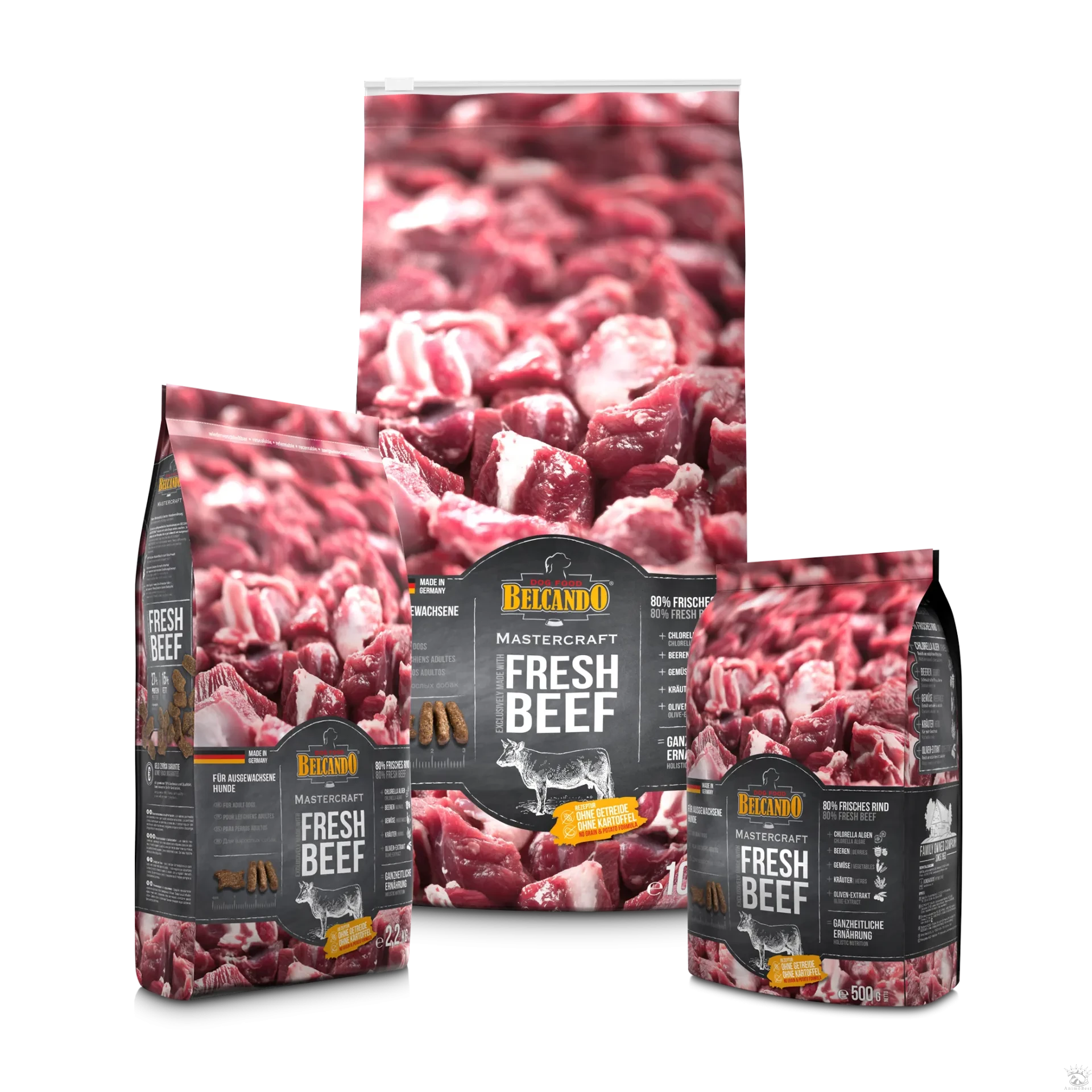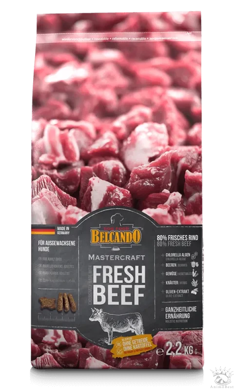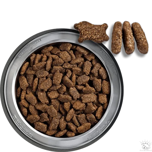 Composition : Viande de bœuf fraîche, foie, rognons (80 %) ; Amarante (5,5 %) ; Farine de pois ; Farine de haricots (Vicia faba) ; Pois chiches, séchés ; Levure de bière, séchée (1 %, source de bêta-glucanes et de mannan-oligosaccharides) ; Zooplancton marin, moulu (Krill, 0,8 %) ; Gousses de caroube, séchées ; Marc de pomme, séché ; Phosphate dicalcique ; Huile de carthame ; Graines de chia (0,4 %) ; Légumes, séchés (total : 0,3 % ; Carottes, Panais, Betterave rouge, Poireau) ; Algues marines calcaires (Maerl) (0,3 %, Lithothamnium calcareum) ; Levures, hydrolysées ; Algues séchées (0,2 %, Chlorella vulgaris) ; Chlorure de sodium ; Canneberges (0,06 %) ; Baies sauvages, séchées (total : 0,06 % ; Sorbes, Cynorhodons, Myrtilles, Baies de sureau, Groseilles) ; Herbes, séchées (total : 0,06 % ; Feuilles d’ortie, Racine de gentiane, Centaurée, Camomille, Fenouil, Cumin, Gui, Achillée millefeuille, Feuilles de mûre) ; Chlorure de potassium ; Yucca schidigera ; Extrait d’olive (0,003 %, Olea europaea).