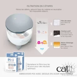Le filtre inclus élimine les débris, les mauvaises odeurs et les impuretés de l’eau de votre chat. De plus, l’eau est adoucie puisque les taux de magnésium et de calcium sont réduits.