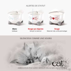 L’abreuvoir Catit PIXI avec dessus en acier inoxydable offre à votre chat une source continue d’eau fraîche et pure. L’eau courante encourage les chats à boire davantage, ce qui aide à prévenir les maladies urinaires. Le couvercle en acier inoxydable hygiénique de haute qualité réduit l’acné féline causée par une allergie au plastique.