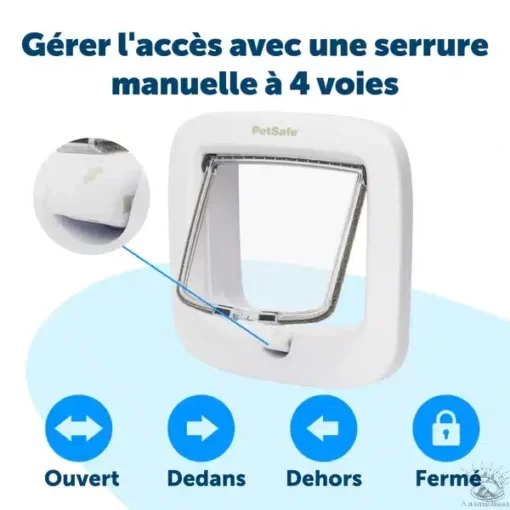 – **4 positions de verrouillage :** Choisissez entre entrée seulement, sortie seulement, entrée et sortie libres, ou verrouillage complet, pour adapter la chatière à vos besoins et à ceux de votre chat.