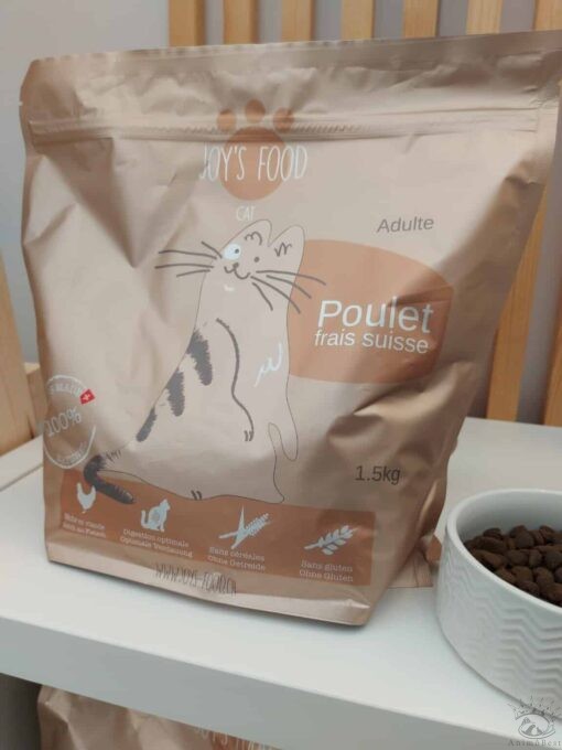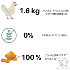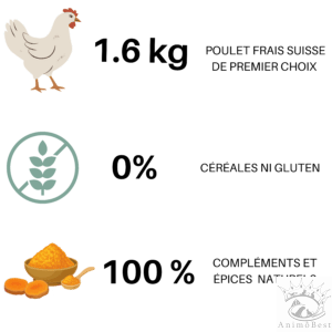 Composition : viande de poulet séchée (30%*), patate douce (16%), graisse de poulet, pois, caroube (3.0%), levure de bière (2.6%), huile de saumon (2.6%), coriandre (0.09%), curcuma (0.13%), cerfeuil (0.05%), mannan-oligosaccarides (0.2%), taurine (0.2%). (*viande de poulet de premier choix 100% Suisse: Equivaut à 1.6 kg de poulet frais)