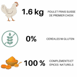 Composition: viande de poulet séchée (30%*), patate douce (16%), graisse de poulet, pois, caroube (3.0%), levure de bière (2.6%), huile de saumon (2.6%), coriandre (0.09%), curcuma (0.13%), cerfeuil (0.05%), mannan-oligosaccarides (0.2%), taurine (0.2%)