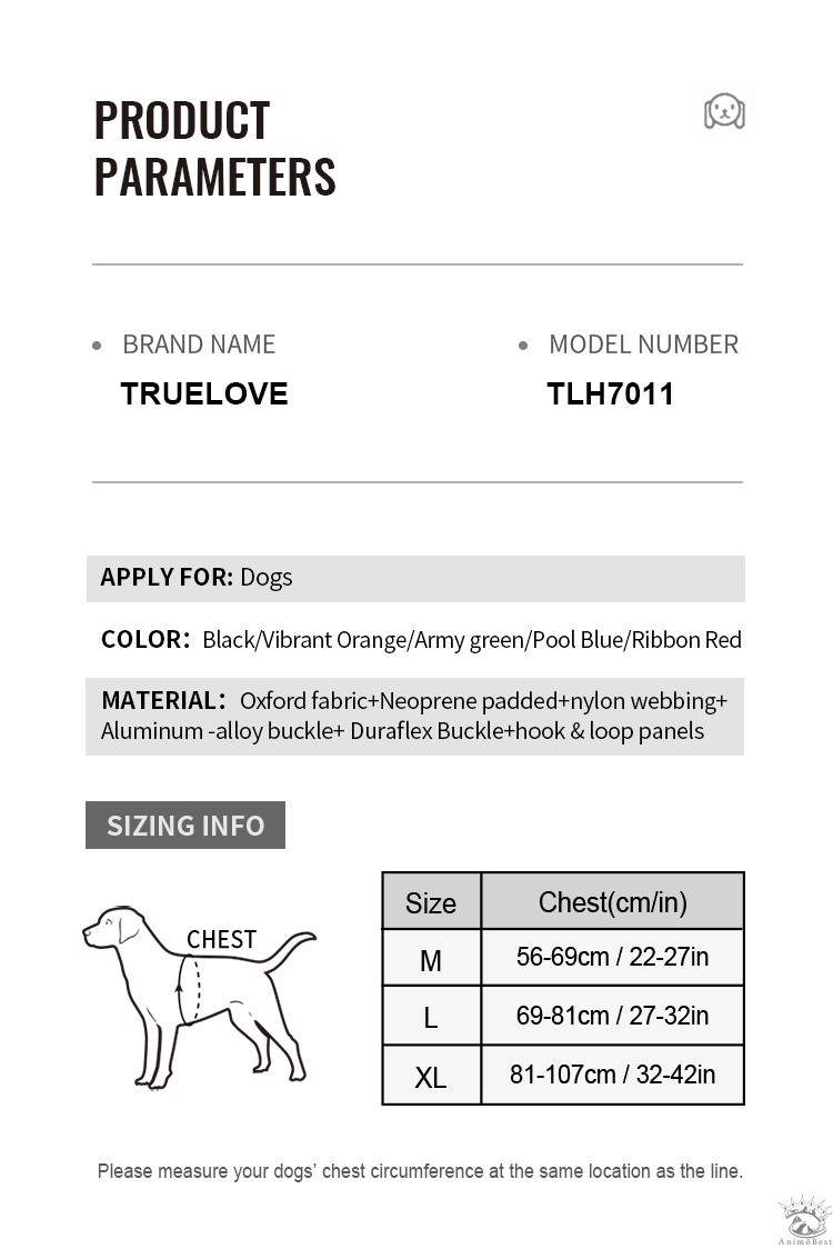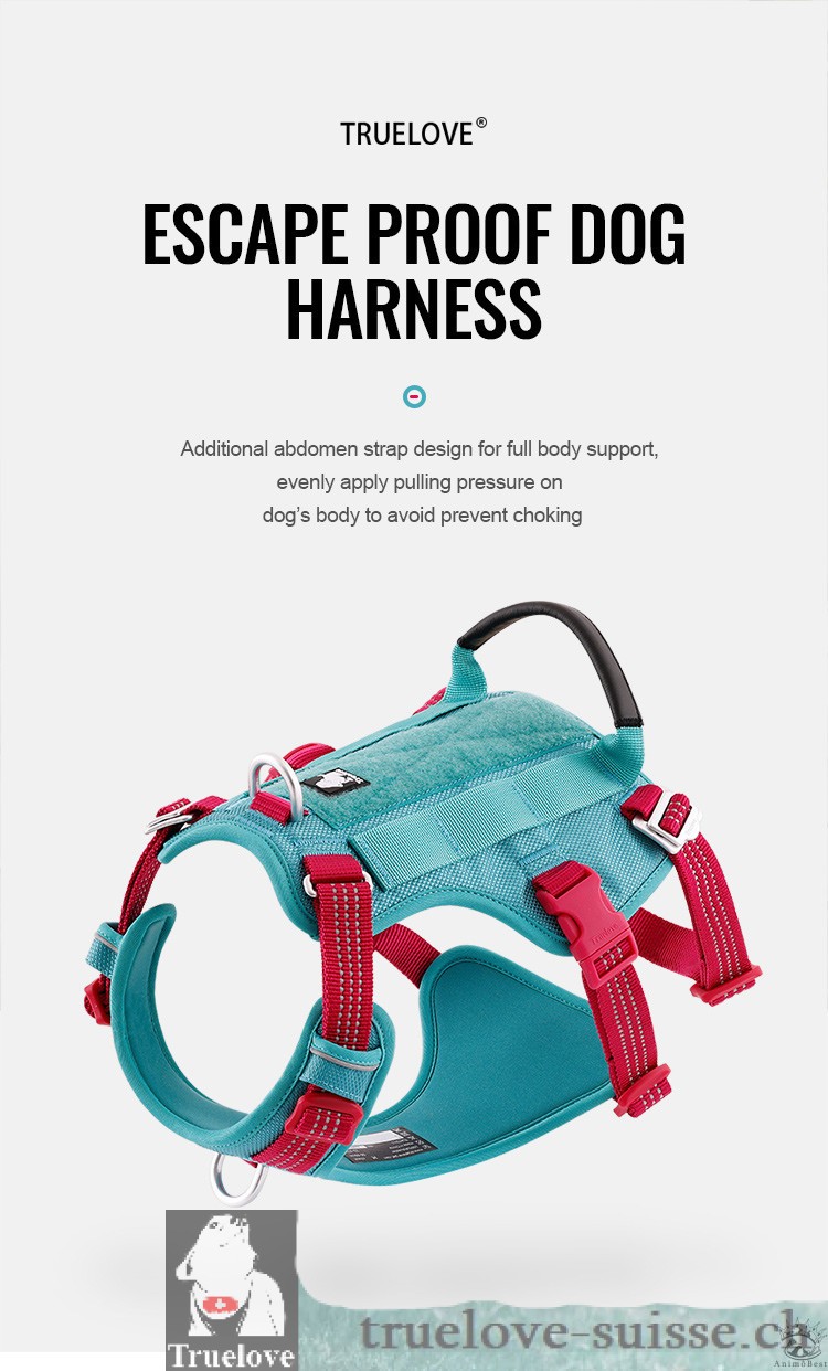 Le harnais Truelove Escape Proof est fabriqué en tissu Oxford de haute qualité avec un rembourrage en néoprène, ce qui le rend à la fois doux pour la peau et durable. La sangle en nylon souple est dotée de bandes réfléchissantes 3M pour offrir une résistance et une durabilité optimales pour une utilisation quotidienne. Les attaches légères en aluminium sur les sangles permettent une mise en place et une prise en main plus pratiques.