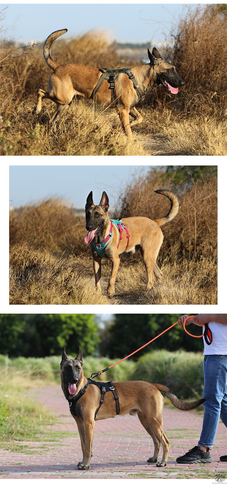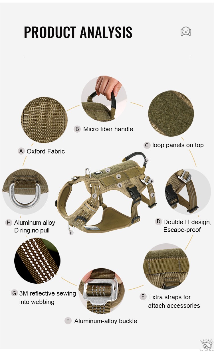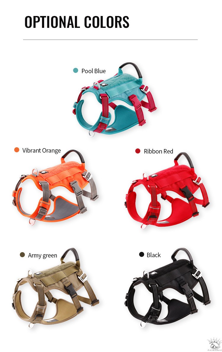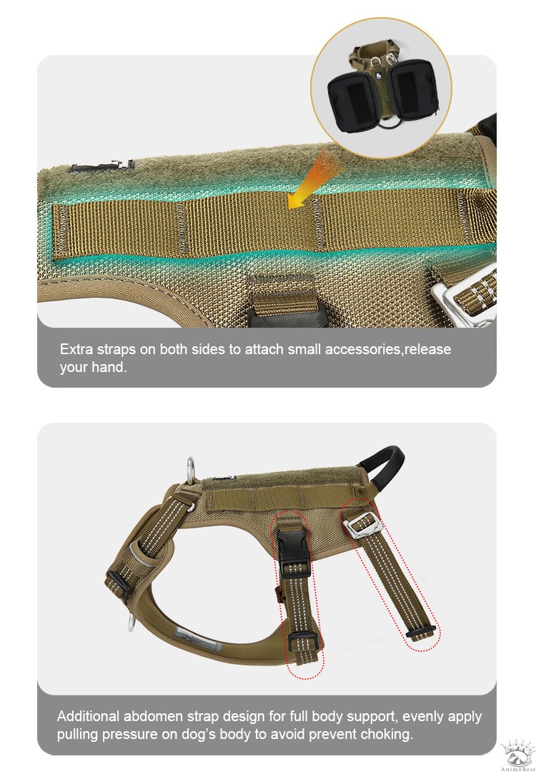 Ce harnais dispose également d’une sangle abdominale supplémentaire pour un soutien corporel complet, appliquant une pression de traction uniforme sur le corps du chien pour éviter tout risque d’étranglement. Il est également équipé de panneaux en boucle et crochet sur le dessus du gilet pour permettre l’ajout de panneaux personnalisés.