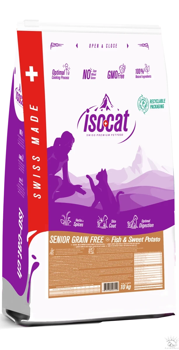 Iso-cat SENIOR GRAIN FREE rich in Fish & Sweet Potato All Breeds offre une solution optimale pour l’alimentation des chats âgés de plus de 7-10 ans, selon l’activité de votre animal.