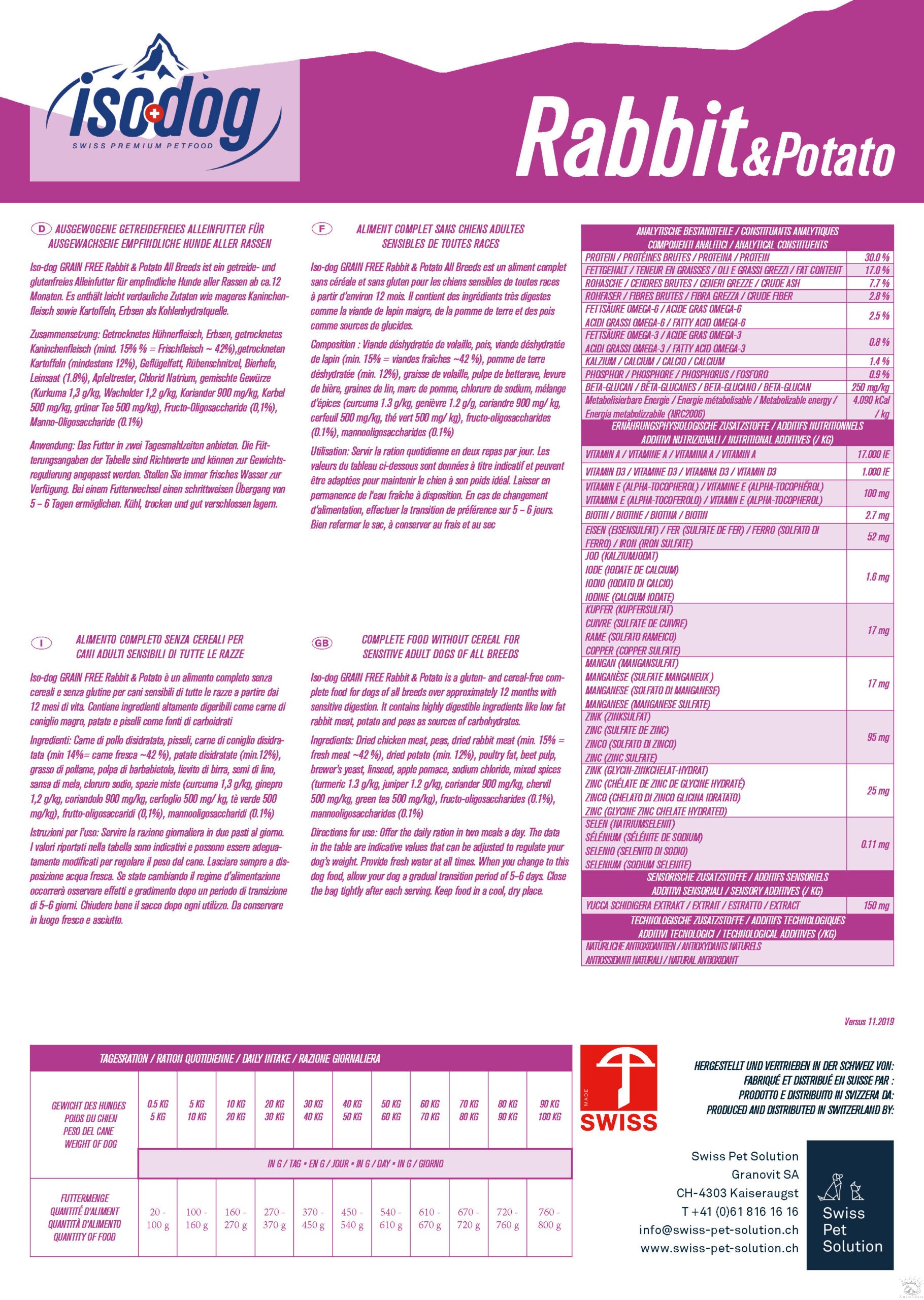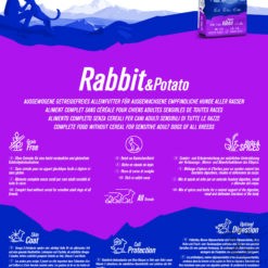 Composition : Viande déshydratée de volaille, pois, viande déshydratée de lapin (min. 15% = viandes fraîches ~42 %), pomme de terre déshydratée (min. 12%), graisse de volaille, pulpe de betterave, levure de bière, graines de lin, marc de pomme, chlorure de sodium, mélange d’épices (curcuma 1.3 g/kg, genièvre 1.2 g/kg, coriandre 900 mg/kg, cerfeuil 500 mg/kg, thé vert 500 mg/kg), fructo-oligosaccharides (0.1%), manno-oligosaccharides (0.1%).
