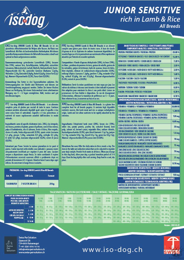 Composition : Viande d’agneau déshydratée (20%), riz brun (19%), riz blanc, protéines de pommes de terre, graisse de volaille, graines de lin extrudées, pulpes de betterave, huile de saumon, levure de bière, fibre végétale, chlorure de sodium, fructo-oligosaccharides (0.5%), mélange d’épices (curcuma 1.3g / kg, genièvre 1.2 / kg, coriandre 0.9g / kg, cerfeuil 0.5g / kg, thé vert 0.5g / kg), Mannan-oligosaccharides (0.2%), yucca ester (0.02%).