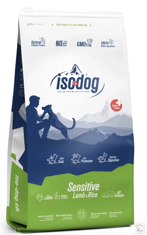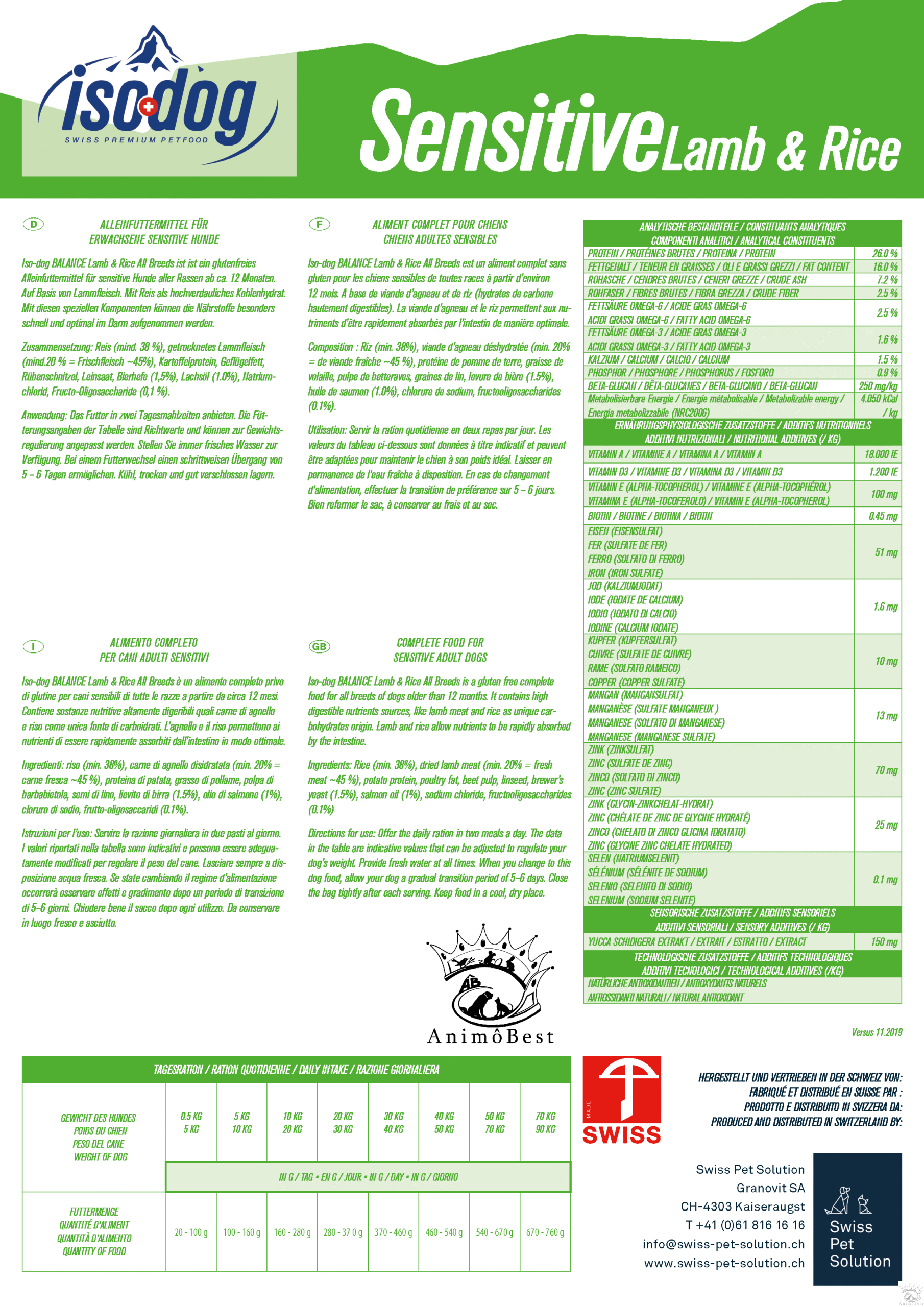 Composition : Riz (min. 38%), viande d’agneau déshydratée (min. 20% = de viande fraîche ~45 %), protéine de pomme de terre, graisse de volaille, pulpe de betteraves, graines de lin, levure de bière (1.5%), huile de saumon (1.0%), chlorure de sodium, fructooligosaccharides (0.1%).