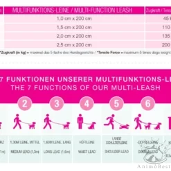 Trois anneaux en D supplémentaires assurent une flexibilité ultime. Vous pouvez utiliser la laisse de 200 cm de long comme laisse courte/moyenne/longue/épaule/hanche ou même double. Des accessoires pratiques peuvent également être fixés.