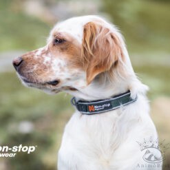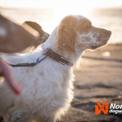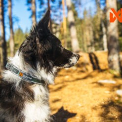 L’intérieur du Roam collar est matelassé de néoprène doux et résistant. Toutes les coutures et les bords de l’intérieur du collier sont cousus avec le côté lisse vers le chien, afin d’assurer une surface uniforme et douce pour éviter les frottements. Les zones exposées sont renforcées par de l’Hypalon. Le collier comporte deux bandes réfléchissantes autour de la partie rembourrée pour une meilleure visibilité sous plusieurs angles.